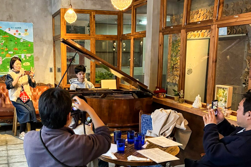 伊豆山の「あいぞめ珈琲店」で演奏を聞く参加者