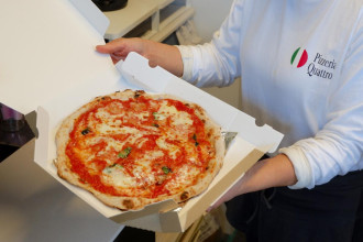 カフェ営業では10時~14時、モーニングメニューを提供。ドリンクメニューは、「コーヒー」「アイスコーヒー」(以上200円)、「カフェオレ」「エスプレッソ」(以上250円)、「カフェラテ」「カフェモカ」(以上300円)など。アルコールメニューは、カクテルやハイボールのほか、ビール(350円~)など25種類以上をそろえる。フードメニューは、切りたて熟成生ハムを使った「生ハムサラダ」(400円)、「生ハムのクリスピーピザ」「濃厚ナポリタン」(以上800円)など。