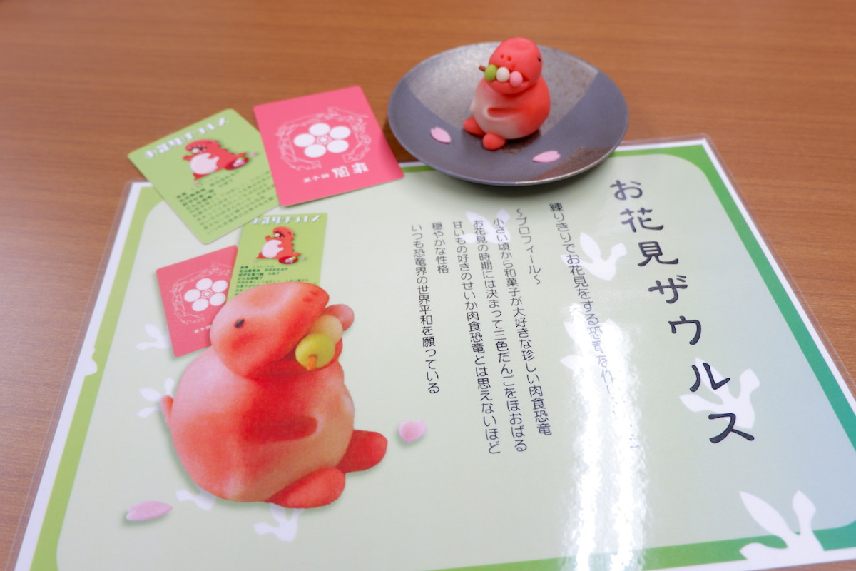 練り切りで仕立てたピンク色のティラノサウルス「お花見ザウルス」