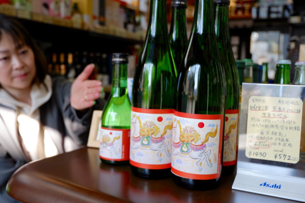 熱海出身・在住の日本画家・坂本武典さんが描いた「干支(えと)ラベル」を貼った純米酒「天虹(てんこう)」が現在、熱海市内の酒販店で販売されている。