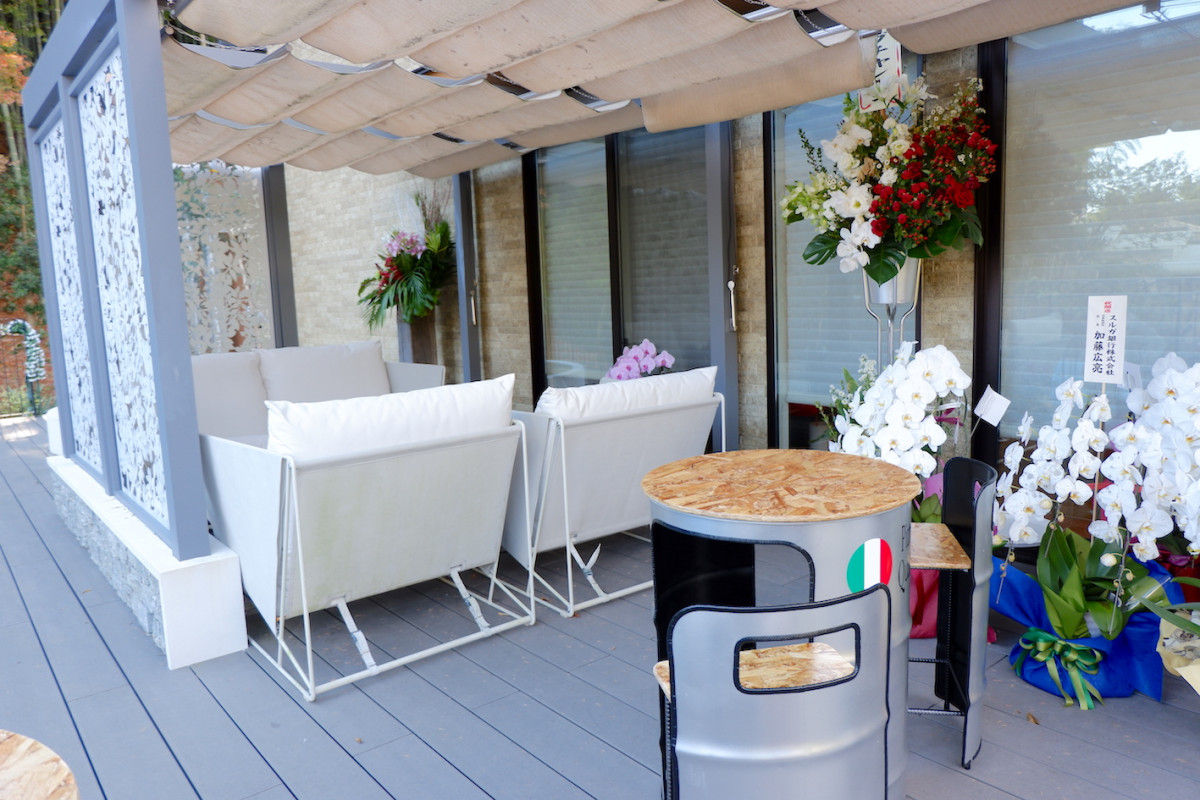 ソファー席を備えたピザ店「Pizzeria Quattro4」テラス席