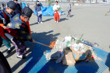 正月飾りやだるまなどを燃やして1年の無病息災を願う伝統行事「どんどん焼き」が1月11日、熱海サンビーチで行われた。