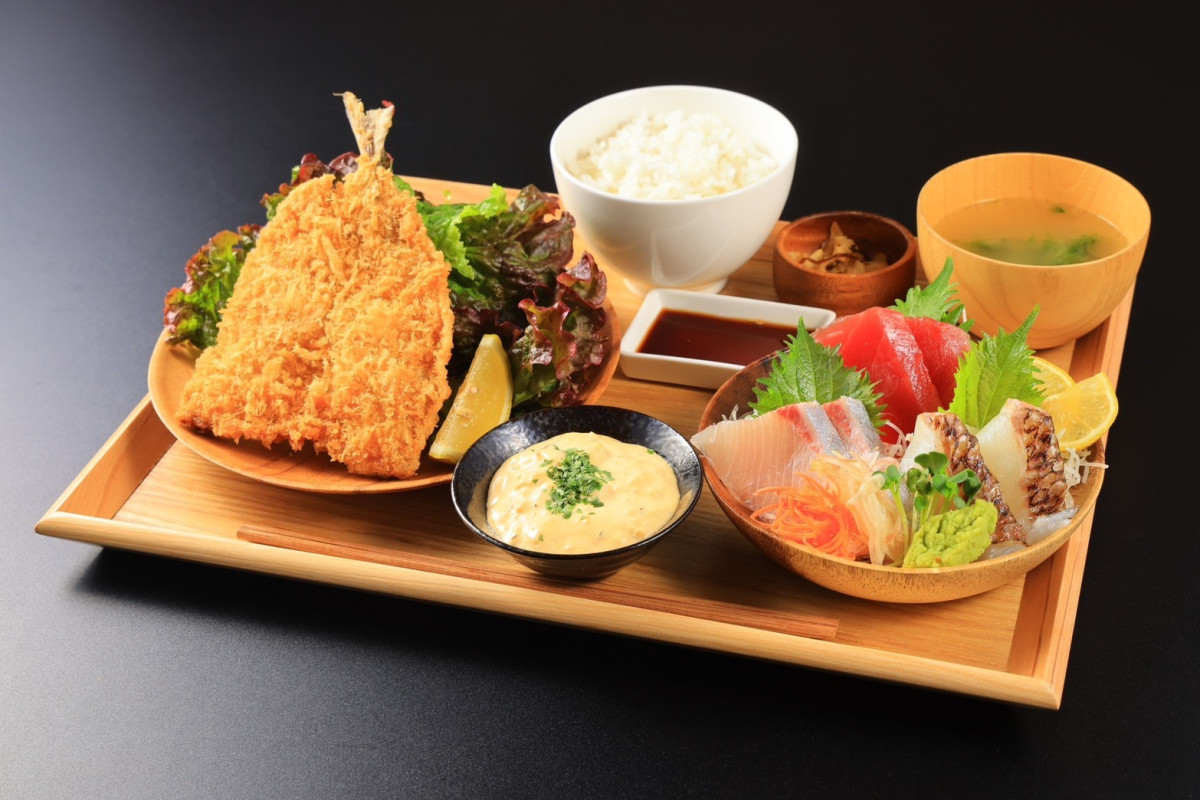 アジフライと刺し身をセットにした定食も