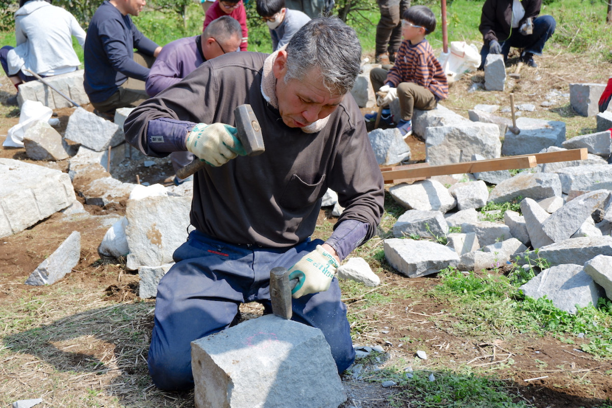 自然体験プログラム「石で炉を作ろう」が3月29日、農園「たからのはたけ」(熱海市泉)で開かれた。